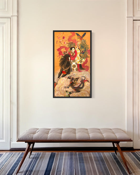 Empress Zhang (Later Liang Dynasty), Stretched Canvas Print, Ready to Hang with D-Ring and Wires, Horse, Horseback Riding, Watercolor on Silk Design, Female Power, Phoenix