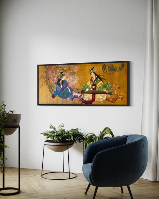 Empress Chen Jiao, Empress Wei Zifu (Han Dynasty) Stretched Canvas Print Playing Guzheng Instrument Spring Time Watercolor Art, Ready to Hang, Installed with D-Ring and Wires