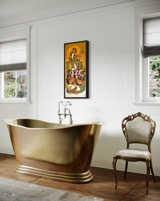 Empress Fu (Han Dynasty) Stretched Canvas Print Silk Scarf Golden Watercolor Art, Rose buds, Ready to Hang, Installed with D-Ring and Wires