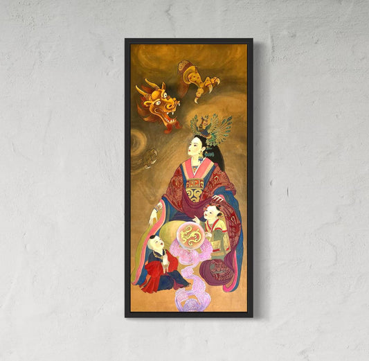 Empress Xu (Han Dynasty), Stretched Canvas Print, featuring Children and Dragon, Chinese Watercolor Art, Ready to Hang, Installed with D-Ring and Wires