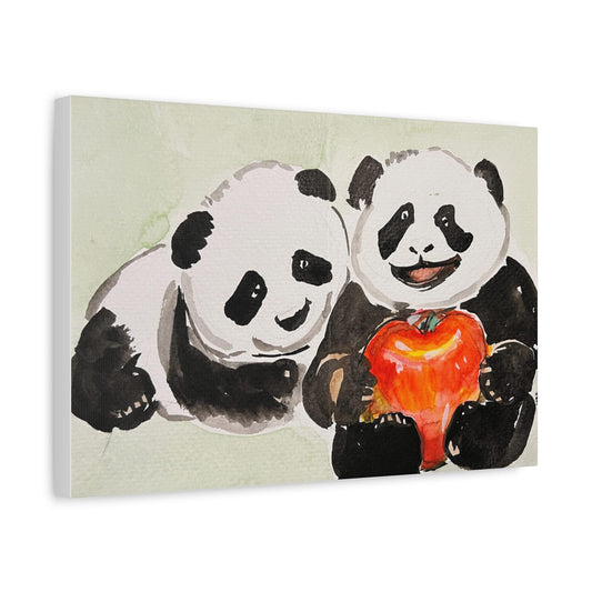 Panda Couple with Apple, Matte Canvas, Stretched, 0.75", Print of Watercolor painting by artist Xiang Li, Panda lover gift, Nursery wall art