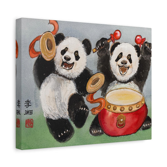 Musical Pandas with Drums, Canvas Wall Art, Giant Pandas Bao Li and Qing Bao, Chinese Watercolor Print, Stretched Matte, Animal Art